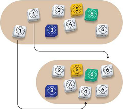 Example: After Carter's initial roll, his dice look like this: 1.1.3.3.4.5.6.6. He has singles of 4 and 5, which cannot be rerolled. He also has sets of Is, 3s, and 6s. He decides to reroll his two Is, and they come up as 4 and 6.