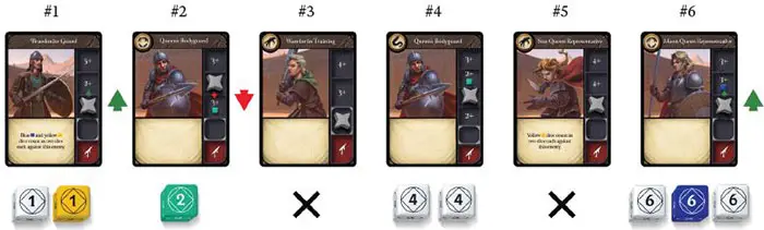 He moves the battle marker down one space on enemy #2 since he has a single 2. He assigned no dice to enemy #3, so nothing happens. Enemy #4 requires two dice, and one of them must be green.