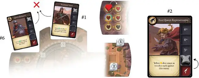 Carter has two 4s, but neither of them are green, so nothing happens. He assigned no dice to enemy #5, so nothing happens. He moves the battle marker up one space on enemy #6 since he has at least three 6s and one of them is blue.