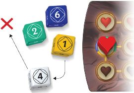 Example: Carter has suffered another wound, and this time the health marker moves into the space on his health track with the stack of colored dice, so he gets to replace a die.