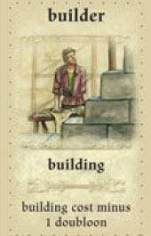 The player who chooses this role, can immediately build one building for one doubloon less than the normal cost as his privilege. He pays the money to the bank, takes the building from the supply, and places it on any empty space in the city on his player board.