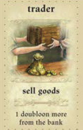 The player who chooses this role, may immediately sell one good to the trading house. He takes from the bank the price associated with the good he sold (0 - 4 doubloons) plus 1 doubloon as his privilege. Then, in clockwise order from the trader, each other player may sell one good to the trading house for the price shown as long as there is room for it in the trading house. The trader phase ends when all players have had one turn to sell or when the trading house is full.