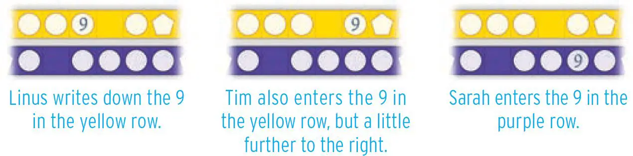 In the yellow row, Tim can enter only the number 1 in the field furthest to the left. In the purple row, he can no longer enter a number between the 6 and 7.