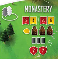 For example, the Monastery shown to the right will reward players 4 Victory Points if they raid with at least 12 Military Strength. Should they have 20 or more Military Strength, they will instead gain 6 Victory Points. Likewise, if they raid with less than 12, they will gain no Victory Points for their Military Strength.