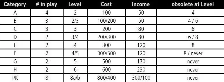 The category determines the number of Railroads available, the level (which determines cost), and the income. In addition, certain levels of Railroads, when bought, will cause lower levels to be made obsolete and removed from the game without compensation.
