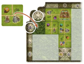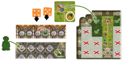 Master builder - Give up one die showing a "5". Cover any tile in your province with another one from the supply. All tiles still need to have a connection to the residence. You cannot use the master builder if you have no matching tiles or dice.