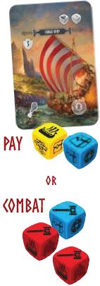 Crew dice which show 2 hammers provide 2 Combat dice. Roll your combat dice and if you meet or exceed the defense number of the Territory tile you are targeting, collect the top tile of the stack and reveal (and collect) the indicated reward.