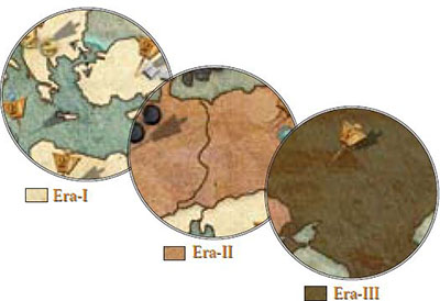 Era-I regions are playable right from the start of the game, Era-II regions may be entered in Era-II, while Era-III regions are only playable in the last era.