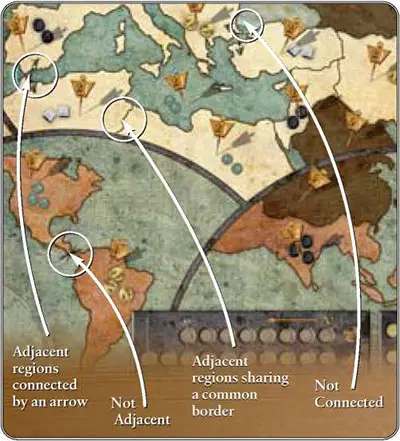 You place your player cubes on the world map into or adjacent to at least one region already having one or more of your player cubes. A region is adjacent to another if it shares a common border or is connected by an arrow.
