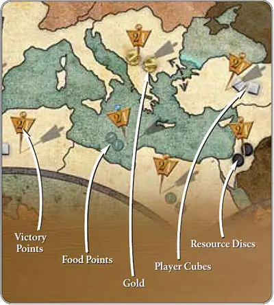 Each region contains a "standard" (banner) with two victory point values. In addition, each Era-I region and Era-II region contains a symbol. If you control a region at the end of a game turn, you receive benefits based on the region's symbol: additional player (population) cubes, gold, resources, or food.