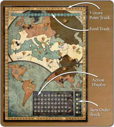 Most of the game board depicts the "known" world and is called "world map". The world map is divided into regions. The color scheme used for the regions signifies which regions are playable during each given era.