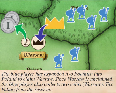 You may use your army to expand into an unclaimed city territory to take control of that city and gain its crown(s).