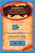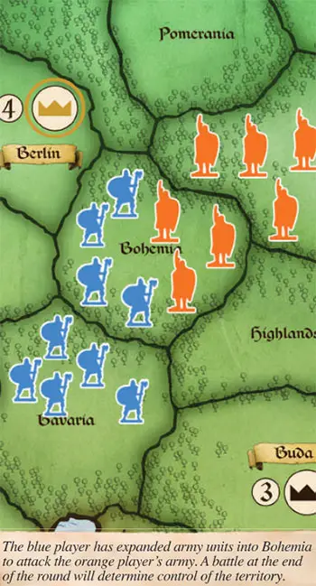 Note: Players may manoeuvre all their army units out of a non-city territory if they choose to do so, but they must leave behind one army unit when leaving city and castle territories.