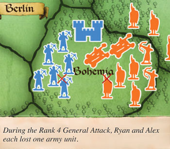 To roll for the attacks in Ranks 1, 2 and 3, both players simply count up the total number of army units they have of that particular type in the disputed territory, then roll the appropriate number of dice for each of those units they control. Only one player will roll for a rank if only that player has units of that type in the disputed territory.