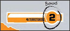 Territories are grouped together into six different continents. The territories are marked in different colors to show which continent they belong to. If you control a whole continent at the start of your turn, you'll get bonus troops.