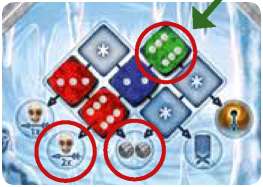 Example: Player Green places a die completing a second line. She then decides to receive the rewards from both lines.