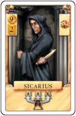 eliminates an opposing, face-up character card. The opposing card and the Sicarius are both discarded.
