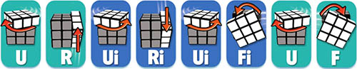 Now turn the whole cube so that white is the "Front" face. If the top white edge isn't solved, just do the sequence once more, followed by "U" to position all the edges properly.