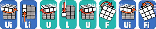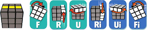 Each face of the cube is assigned a letter (shown below). Each step is made up of a sequence of twists (a one quarter-turn of the face of the cube).