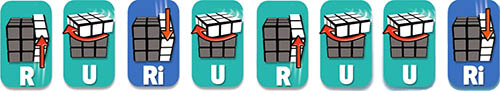 Hint: Hold the cube with red in front. Turn the top layer until the red and blue edge piece is solved as in the picture, and then repeat the sequence below until the yellow and blue edge piece is also solved, on the right side.