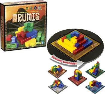 The solitaire version: RUMIS can be played alone in various ways. You could try to build a multicolored cubes in various sizes (e.g. 3x3x3, 4x4x4 or 5x5x5). Using only pieces of one or two colors is more tricky. Will you find out how many ways there are to build a 3x3x3 cube in one color?