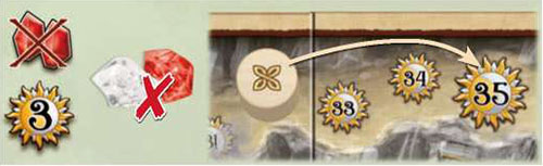 The player may decide for each of their two rows of power containing at least 2 artifacts if they want to discard all artifacts from that row in order to gain power points and one rune stone from the display, or to keep them for later use. If they decide to discard the artifacts, they gain power points as follows: