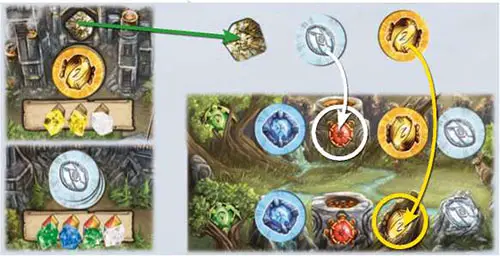 Example: The player forges two artifacts. For the first he pays two yellow gems and one wild gem. He immediately gains an ore from the supply and places the yellow artifact in the lower power row, since there is a yellow artifact already present in the top row.