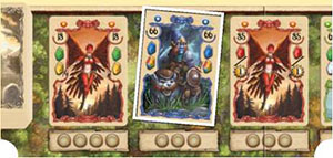 Example: The player has 3 magic points at his disposal. He decides to summon the blue card for 2 and the green card for 1 magic point. He places the summoned cards as well as his played cards in his discard pile.