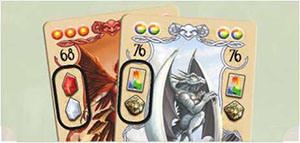 Example: The player utilizes the ability of the blue card first and discards a blue gem to get 2 wild gems from the supply. She then uses one of these wild gems to activate the second (green) card, discarding it to receive 3 gems (a red, yellow, and blue) from the supply.