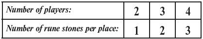 Sort the rune stones by their front sides. Place one fewer than the number of players of each rune stone type (see table) on each of the eight spaces on the game board.