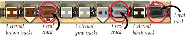 Each player receives 3 black tracks from the supply and places them on the first space of each of the three railroads pictured on her player board.