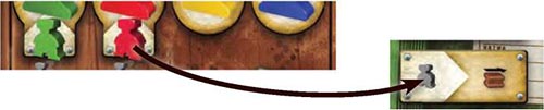 Once every player has passed, the players who placed a worker under the turn order track remove their pawn. To free the turn order spaces, the other pawns are moved to the right (towards the last spaces of the turn order track). Then, the players place their pawn on the turn order space above their worker.