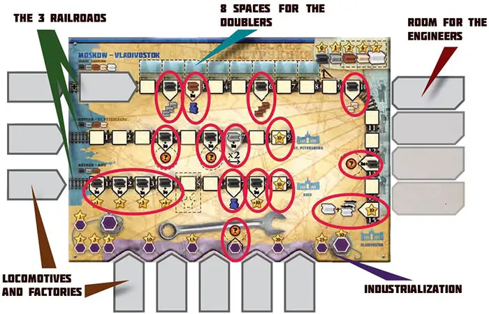 Important note for this railroad: when a player reaches space 7 of this railroad with his gray rail and a locomotive, the value of all scored spaces on his St.Petersburg railroad are doubled.
