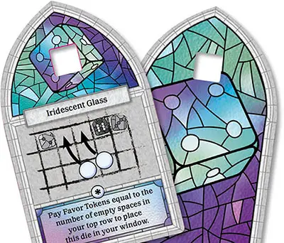As an action, a player may pay Favor Tokens to use a Rare Glass Board, taking a Rare Glass Die from it to place in their window. Unless otherwise indicated, this may be done at any time during their turn.