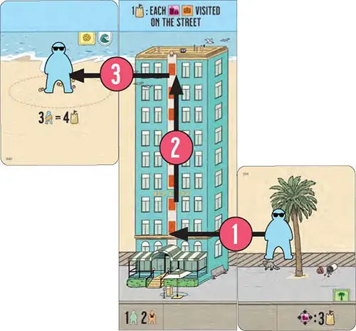 The placement action on your feature card may show symbols that will either add people to your city, give you sand dollars, or allow you to move people that you placed on previous turns. Not every card will have a placement action, but many of them do.
