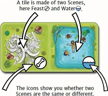 When you play a tile, each of its Scenes connected to one or more tiles already in play earns you Food Points. Advance your Food Points token on the Sco- retrack as many spaces as the value indicated on the Square that this Scene covers.