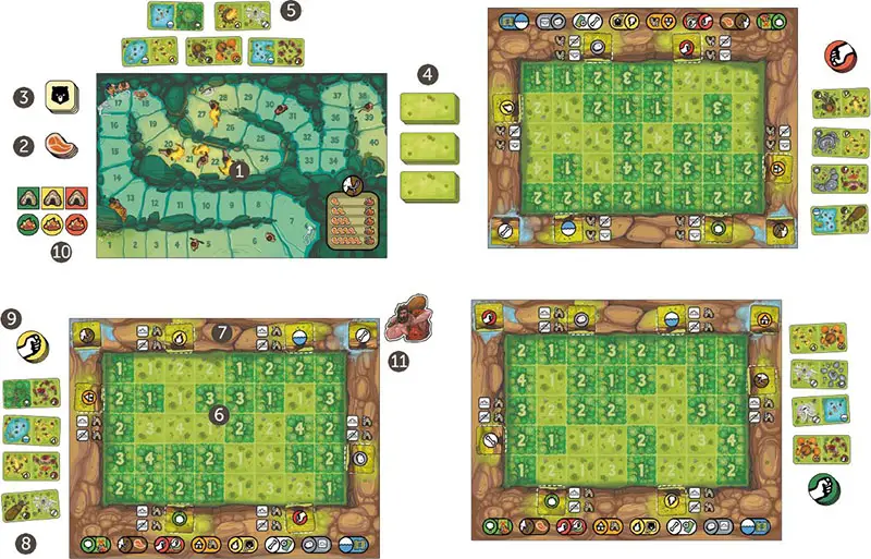 The youngest player places the First Player token 11 in front of him. He starts the game.