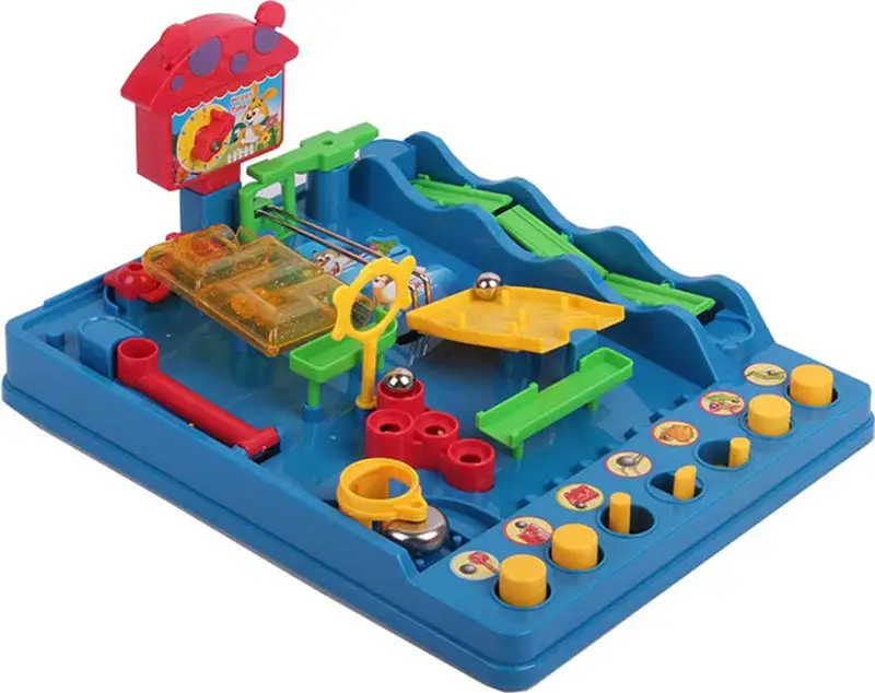 5to bounce the ball up each level and finally through the vertical hoop and onto the blind maze.Turn lever