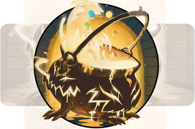 As long as energy is on the Glutton Cauldron, it cannot be used. When the Glutton Cauldron gains its 7th energy, its effects are applied immediately: sacrifice it. place the energy from the Glutton Cauldron in your re- serve and move your sorcerer token forward 15 spaces on the crystal track.