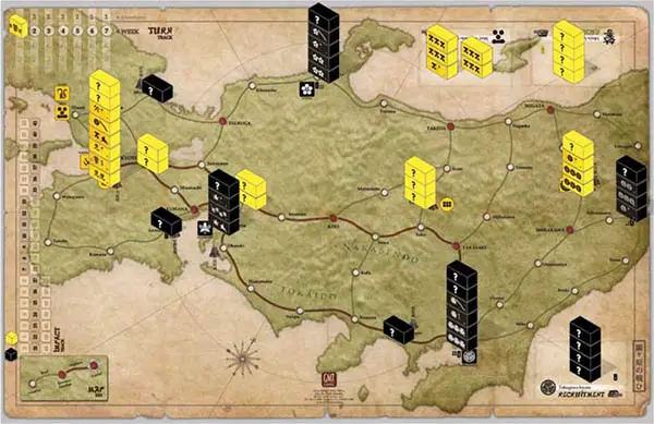 Board: The board represents central Honshu, the largest island of Japan, where the majority of the fighting took place. The board contains the map and the locations in play, the Impact track, the Turn Track, and the Recruitment Boxes.