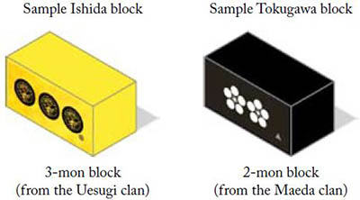 Apply the gold-colored Ishida Mitsunari labels to the gold-colored blocks; and apply the black Tokugawa Ieyasu stickers to the black blocks. All blocks and disks receive only one sticker except the square Turn Track block which receives a black and a gold sticker. There are no stickers for the small cubes.