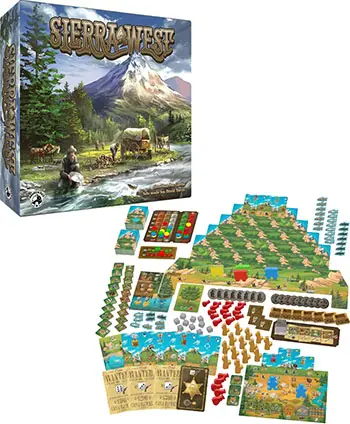 Place the mountain base/wagon trail board in the middle of the table. Place the homestead scoring board next to it.