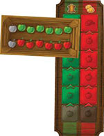 Place the apple supply board near the general supply. Place the green marker on the leftmost space of the green Granny Smith track, an the red marker on the leftmost space of the Red Delicious track.