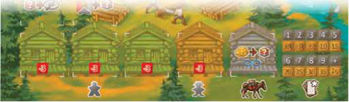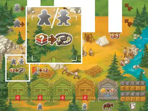 You may build a cabin tile from the cabin market board and add it to your player board during your Pioneering Step. Cabins have special rule-bending abilities, and prevent you from losing points at the end of the game (see Cabins and Scoring below).