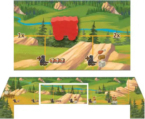 The frontiersman is placed on the mountain base; the wagon is placed on the trailhead of the wagon trail (marked with a wagon illustration); and the two pioneers are placed on the player's board (idle in their camp area).