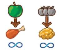 Spend apples of the indicated color(s) and quantities to gain the resource(s) shown.