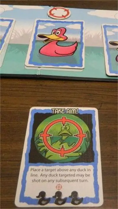 The current player has played a Take Aim card and has chosen to target the space currently occupied by the pink duck.