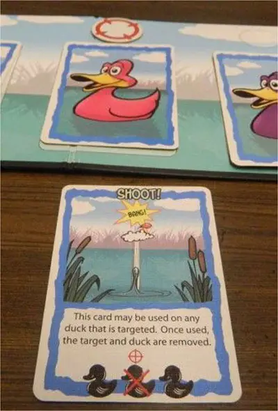 When ducks are shot they are removed from the board and are given to the player of the matching color. When a duck is shot, all ducks behind the shot duck are moved forward and a new card is drawn from the duck deck to fill in the last spot.