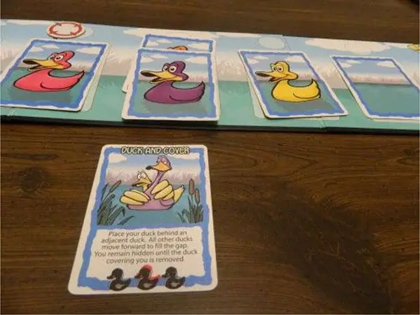 Duck and Cover: You can place one of your ducks behind an adjacent duck (not empty water). If there are no ducks adjacent to one of your ducks, you cannot play the card.