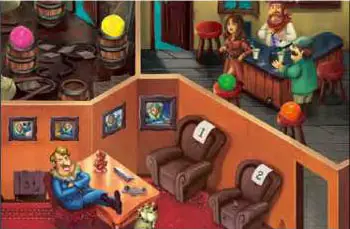 Place the game board in front of the rolling track. Three rooms are depicted on the game map: the junk room, the bar, and the boss's office.